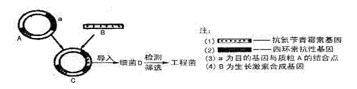 30、下图是将人的生长激素基因导入细菌D细胞内,产生“工程菌”的示意图。所用的载体为质粒A。若已知细菌D细胞内不含质粒A,也不含质粒A上的基因,质粒A导入细菌后,其上的基因能得到表达。能表明目的基因已与运载体结合,并被导入受体细胞的结果是