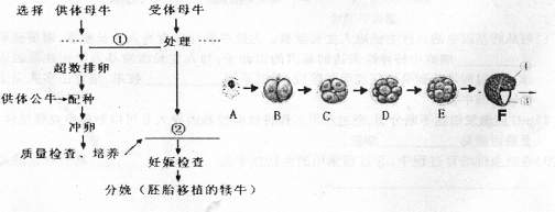 42、下图表示胚胎移植的基本程序、早期胚胎发育过程。请回答下列问题(10分):