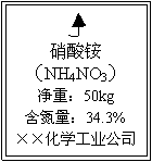 某校902班小东同学从网上收集的某硝酸铵化肥外包装袋标签如图所示,请计算该袋化肥的纯度(即化肥中硝酸铵的质量分数)。