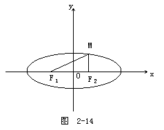 以两定点F1、F2的直线为x轴,线段F1F2的垂直平分线为y轴,建立直角坐标系(如图2-14).设|F1F2|=2c(c>0),M(x,y)为椭圆上任意一点,则有F1(-1,0),F2(c,0).