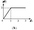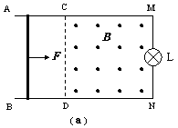 5.如图(a)所示,AM、BN两光滑水平导轨放置在同一水平面内,间距为0.5m,导轨电阻不计。M、N之间连接一阻值为2 W的灯泡L。在虚线CD右侧区域内有竖直向上的匀![]()