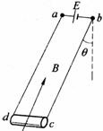 (12分)如图所示,有一金属棒cd重为G,长为L,电阻为R, 用质量不计的导线将其两端焊接,并在ab两点将它悬挂起来,接在电压为E的电源上。当加一个与abcd平面平行的均匀磁场时,平面abcd偏过竖直方向θ角,金属棒恰好处于平衡状态。