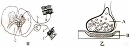(1)甲图中f表示的结构是_____________,乙图是甲图中____________(填字母)的亚显微结构放大模式图,乙图中的B是下一个神经元的_________________。