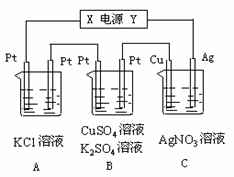 (6分)如图所示,若电解5min时铜电极质量增加2.16g,B池的两极都有气体产生。