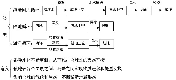 能量来源:外因--太阳辐射能、重力能,内因--水的三相变化