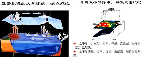 正常年份,在赤道附近及其以南海区,太平洋西部温度高、海面高,东部温度低、海面低的状态下形成的。如图所示: