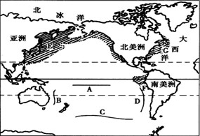 (1)图中A、B、D三处, 处理藏着丰富的煤、石油等矿产资源 处广泛分布着锰结核。C箭头含义: 。