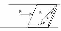 将某种材料的长方体锯成A、B两块,放在水平桌面上,并紧靠在一起,物体A的角度如图所示,现用水平方向的力F推物体,使A、B保持矩形整体沿力F方向匀速运动,则下列说法正确的是