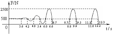 在2004年雅典奥运会上,我国运动员黄珊汕第一次参加蹦床项目的比赛即取得了第三名的优异成绩.假设表演时运动员仅在竖直方向运动,通过传感器将弹簧床面与运动员间的弹力随时间变化的规律在计算机上绘制出如图所示的曲线,当地重力加速度为g=10m/s2,则蹦床运动稳定后的运动周期为____________s,运动过程中,运动员离开弹簧床上升的最大高度为____________m,最大加速度为_____________m/s2。