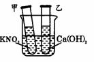 如图所示,甲、乙两试管中分别盛有硝酸钾、石灰水的饱和溶液,并都有少量固体存在。若向试管外盛有水的烧杯中加入氢氧化钠固体,请分析推断产生的现象和相关的原因。