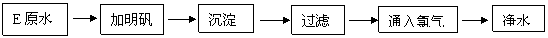 解析:本题综合考查了水的人工净化方法和步骤,以及在人工净化过程中各步的作用。明矾是一种净水剂,其溶于水后形成胶状物可以吸附水中悬浮杂质而沉降。沉淀:是水中的大颗粒物质由于密度较大而沉降到底部的过程。过滤:除去水中悬浮的固体物质。通入氯气可生成次氯酸,起到杀菌消毒的作用。
