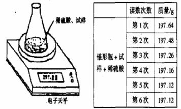 7.(2005年·重庆)用下图装置测定因存放不当而部分变成碳酸钠的烧碱中氢氧化钠的质量分数。所取试样质量8.00 g、锥形瓶质量140.00 g,加入足量稀硫酸(质量为50.00 g)每隔相同时间读数一次,数据如下表: