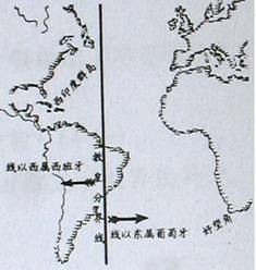 33、1494年,西班牙和葡萄牙在教皇仲裁下,划定了一条如图所示的分界线。这意味着![]()