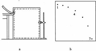 ⑵如图b所示,为一平抛物体运动的闪光照片示意图,照片与实际大小相比缩小到1/10.对照片中小球的位置进行测量,可得1与4闪光点竖直距离为1.5 cm,4与7闪光点竖直距离为2.5 cm,各闪光点之间水平距离均为0.5 cm.则小球抛出时的速度大小为 m/s;抛出点距闪光点1的实际水平距离为 cm,实际竖直距离为 cm.(不计空气阻力,g取10m/s2)
