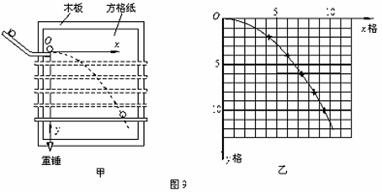 1、某同学在“研究平抛物体的运动” 的实验中,在已经判定平抛运动在竖直方向为自由落体运动后,再来用图9甲所示实验装置研究水平方向的运动。他先调整斜槽轨道槽口末端水平,然后在方格纸(甲图中未画出方格)上建立好直角坐标系xOy,将方格纸上的坐标原点O与轨道槽口末端重合,Oy轴与重垂线重合,Ox轴水平。实验中使小球每次都从斜槽同一高度由静止滚下,经过一段水平轨道后抛出。依次均匀下移水平挡板的位置,分别得到小球在挡板上的落点,并在方格纸上标出相应的点迹,再用平滑曲线将方格纸上的点迹连成小球的运动轨迹如图9乙所示。已知方格边长为L,重力加速度为g。