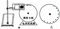 3、为测量小电动机正常工作(匀速转动)时的角速度,采用了如图甲所示的实验装置:半径不大的圆形卡纸固定在电动机转轴上,可在电动机的带动下随电动机转动。在圆形卡纸旁边垂直安装一个改装了的电火花计时器。