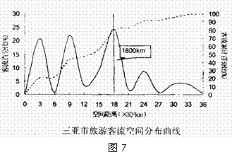 旅游客流量一般会随着与目的地距离的增加而逐渐减少、但是由于其它因素的作用,旅游客流量的空间分布会在距离衰减规律的基础上产生一定的波动。读图7,回答21-22题。