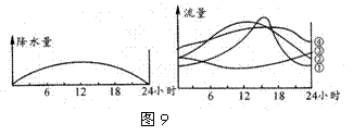 图9为某地降水量与河流径流量日变化示意图,其中最能反映集水区域内植被覆盖良好的流量曲线是 ( )