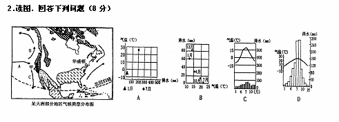 (2)北京的气温年较差为31. 2°C,华盛顿(38. 8°N)的气温年较差为25.3°C,北京的年较差大于华盛顿的主要原因是北京 。