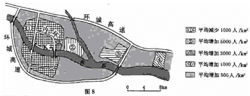 图8为“我国1990-2007年某城市各区人口密度变化示意图”。读图回答17-18题。