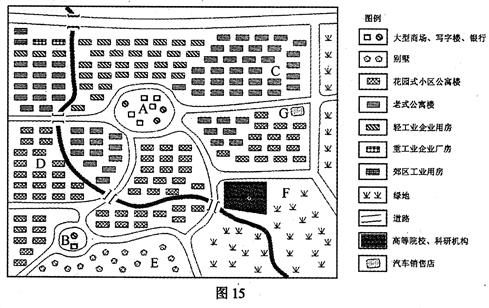28.某城市内部的地域结构为多核心结构。图15是该城市的建筑与道路分布示意图。读图回答下列问题。(14分)