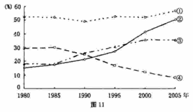 图11为“江苏省三大产业产值比重与城市人口比重的变化图”。读图回答25-26题。