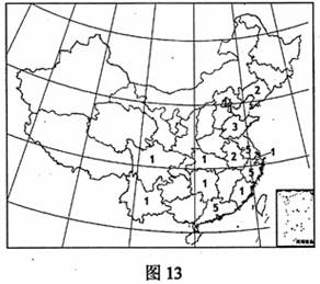 《中国城市竞争力报告》依据居住环境、生态环境等14项指标,对我国200个城市2006年度宜居状况做了评估。图13中数字是前30名的城市在各省级行政区的分布个数。读图回答25-26题。