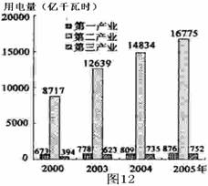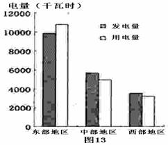 27.图12为“2000-2005年我国三大产业用电量柱状图”,图13为“2003年我国东、中、西部发电量和用电量柱状图”。读图回答下列问题。(13分)