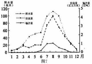 图7为“我国某河流中游水文观测站多年月平均降水量、径流量、输沙量变化图”。读图回答14-16题。