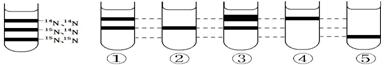 24、细菌在15N培养基中繁殖数代后,使细菌DNA的含氮碱基皆含有15N,然后再移入14N培养基中培养,抽取其子代的DNA经高速离心分离,下图-…为可能的结果,下列叙述错误的是![]()