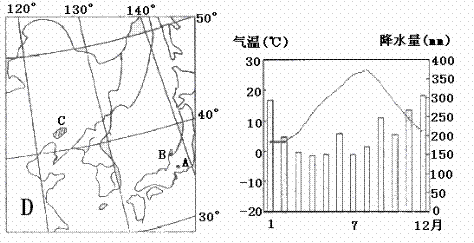 (2) 比较同纬度的A地与D地在气候特征和气候类型分布方面最突出的差异。(6分)