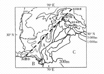 (1) 瓜德尔港所临的边缘海B是 ,试分析该港口附近地区气候干旱的原因。(4分)