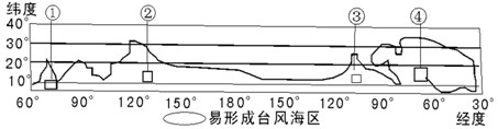 [解析](1)根据本题附图图例,图中找到180°经线,看出在该经线附近,易形成台风海区的分布北界位于北纬10°-20°之间。(2) 大西洋地区的强热带气旋称之为飓风,根据世界国家和大洋分布位置,在图中60°W经线附近海区应该为美国附近的大西洋,故图中④处为影响美国墨西哥湾沿岸地区的飓风生成地。(3)读图得知:①位于70°E,10°N附近,按照世界大洋分布位置,该处为印度洋,而北印度洋洋流系统为季风环流,属风海流。根据洋流分布,②处为暖流经过海区,④处附近海区的洋流为风海流。根据世界主要渔场分布,③处没有洋流交汇也没有上升海流的作用,故不能形成世界著名大渔场。