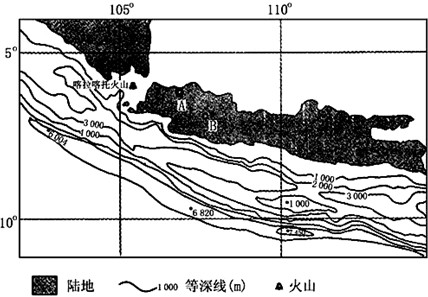 [解析](1)依据等深线,图中地区的海拔最低处为-7 450米。题干中提醒,该火山的海拔高度为813米,“相对高度”为两地海拔高度的差额,即813-(-7 450)=8 263米。通过经纬度和海域轮廓可以判断出该地区为印度尼西亚,其首都为雅加达。