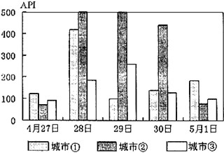 (2)本题“先后经过”,可理解为由北向南“依次经过”,这样本题的关键就是根据空气污染指数的坐标图,判断图中序号①②③各代表三个城市的哪一个。判断的根据是按照我国华北地区沙尘天气发生过程的一般规律,位置越北的地方,沙尘天气开始的越早,污染的程度越重,持续的时间也比较长,城市②污染最严重,持续时间也最长,应该是呼和浩特,城市③污染最轻,持续时间较短,应该是石家庄。所以答案应该是B。