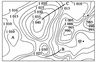 26.(16分)读“北半球部分地区某时刻地面等压线图”,回答问题。