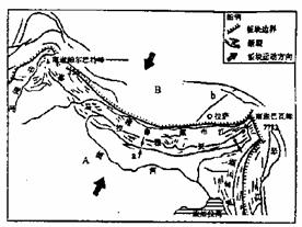 (1)板块名称:A ,B ,喜马拉雅山脉是此两大板块 运动的结果。 (江或河)谷地是两板块之间的消逝的遗痕——地缝合线。