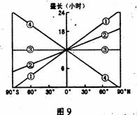 17.飞船返回时,图9中各线能够表示全球昼长随纬度分布规律的是
