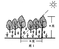 图1为该地"某日太阳处在最高位置时的示意图",此时北京时间为12 : 40,树影遮档地被植物的面积在一年中达到正午时的最大。读图回答1一2题。