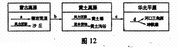 (2006江苏)蒙古高原、黄土高原和华北平原因外力作用在咸固上具有一定的联系。图12中各字母表示不同的主导外力作用类型,读圈回答25-26题