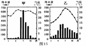 3.(2008年江苏卷)图14为“甲、乙两地地理位置示意图”,图15为“甲、乙两地年内气温与降水量变化图”。读图回答下列问题。(13分)