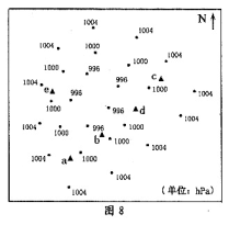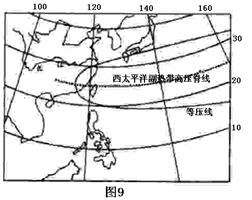(2008江苏高考)我国东部地区的主要锋面雨带,通常位于西太平洋副热带高压脊线以北5-8个纬度距离处,并随西太平洋副热带高压的北进南退而移动。图9为“西太平洋副热带高压脊线位置示意图”。读图回答19-20题。