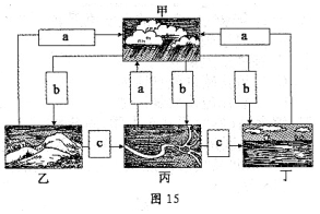 (1)图中丁 甲 丙 丁过程属于 ▲ 循环。水循环的主要地理意义是 ▲ 。(5分)
