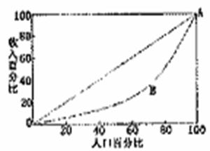 右图中图形OAB的面积和它所处的三角形面积的比值称为基尼系数,是国际通用的衡量收入差距的指标。系数越大,表明一国居民收入差距越大。一般来说,该系数在0.3-0.4之间为宜。目前,我国整体基尼系数大约为0.45左右。这意味着我国 ![]()