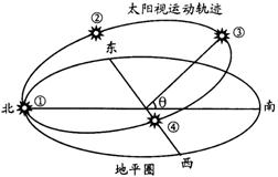 右图为在某地一天中所看到的太阳视运动轨迹图,该地这一天太阳至③位置时的太阳高度角最大(为42°)。读图回答8-10题。