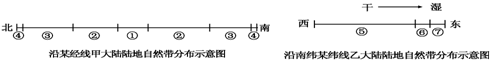 下图中数码①-⑦代表陆地自然带,“干”、“湿”表示水分状况。读图回答3-4题 :