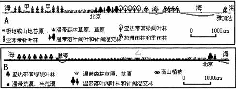 下图中,A图为从雅加达到北京附近沿经线的植被分布示意图,B图为经北京附近沿纬线的植被分布示意图。读图回答11-12题。