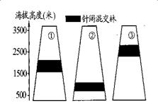 读下图:①(105°E,26°N),②(128°E,42°N),③(90°E,43°N)三个地点的山地针阔混交林垂直分布示意图,回答22-23题。