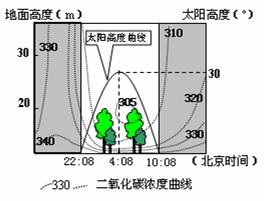 下图是世界某静风林区空气中CO2浓度(单位:ppm)时空分布及太阳高度日变化图,据图判断31-33题