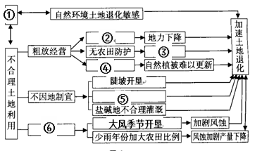 中国北方农牧交错地带是指东北、黄淮农区的草原牧区的过渡地带,广义范围是指年降水量在250-500mm的地区,这里是生态环境最不稳定而且脆弱、人类利用也最不稳定的地带。读农牧交错地带土地退化过程示意图(图2),将正确选项的代号填入图中对应的框内(每个字母限填一次)。(6分)